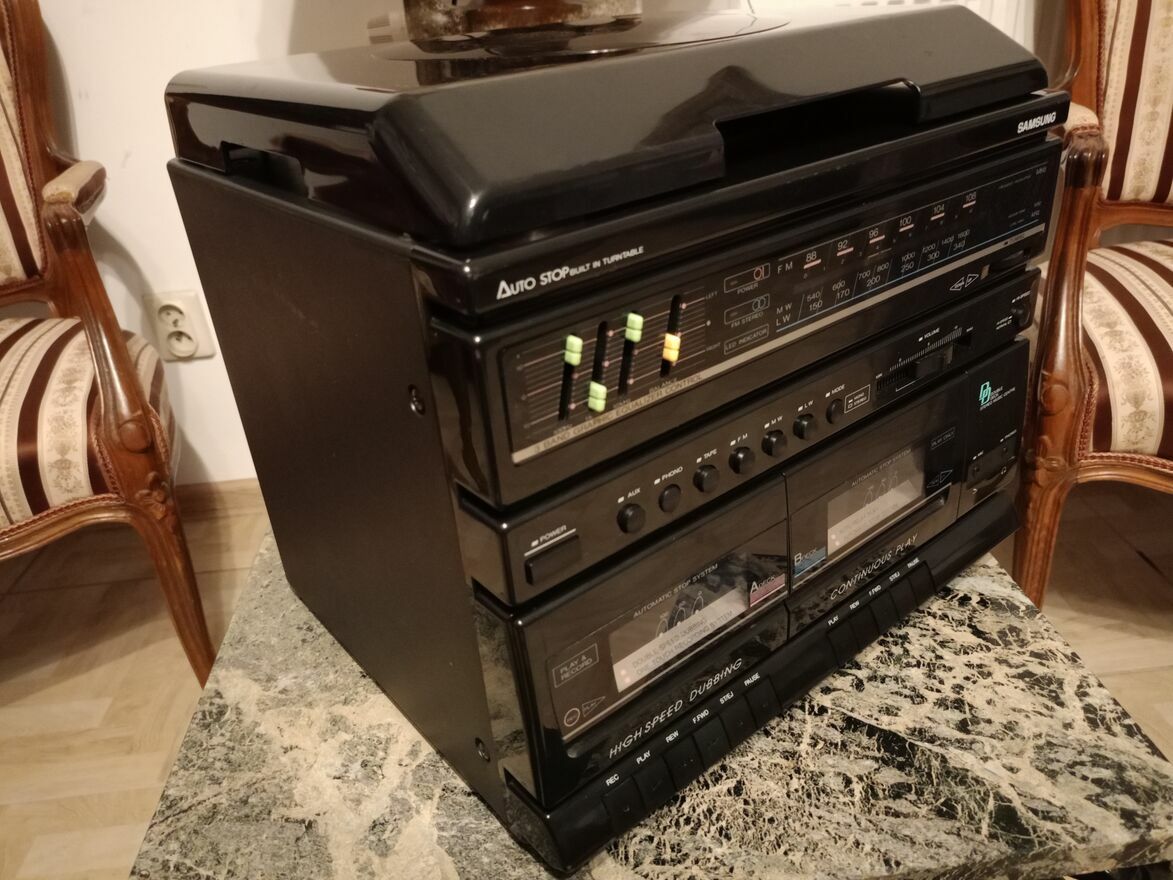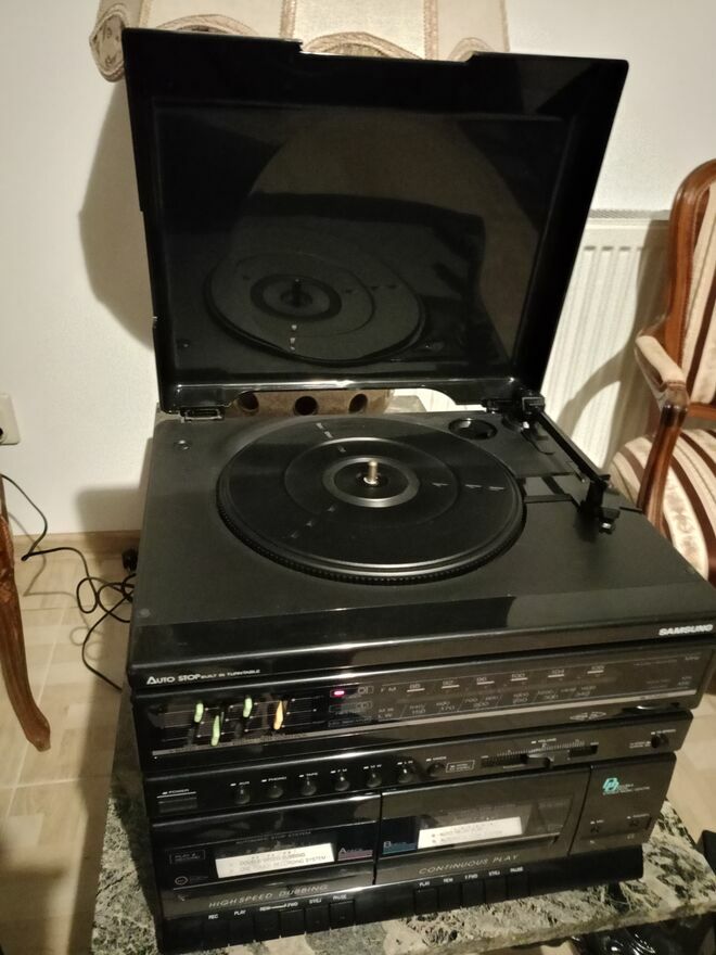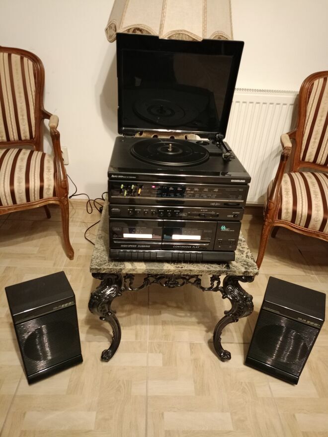 Wieża posiada sprawny dwukasetowy magnetofon i radio, a gramofon nie posiada igły, poza tym działa.